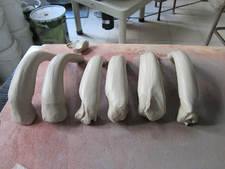 - Prenez un bloc de terre et allongez le un peu pour en faire un petit colombin épais. Pour mes mugs à 500g, j'ai du prendre 150 - 200g pour les anses; j'aurais pu en prendre moins.