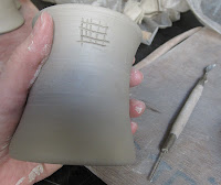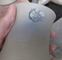 Pour la fixer, quelques égratignures, un peu de barbotine, et hop, on presse l'anse fermement contre la parois. Ceci laisse des traces de doigts sympathiques.