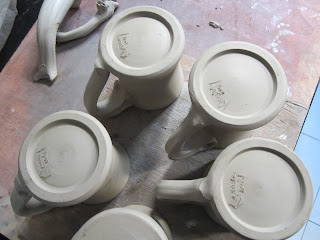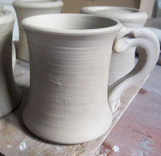 En plus, je sais que A. va les regarder et me dire, "Mais, tu arrives à mettre ta main là dedans ?!?" Hmm... Je vais quand même les laisse sécher. Je vais continuer à tourner des mugs et faire des anses, jusqu'à ce que je produise des anses jolies, confortables en main, et qui s'accordent avec leur mugs !