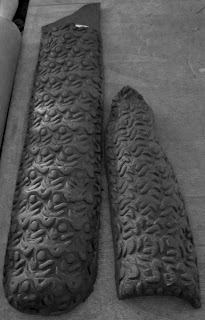Dans la poursuite de nouvelles textures qui peuvent rendre les formes plus intéressantes, j'ai aussi rajouté un nouveau tampon à ma petite collection. Voici les premières pièces recouvertes de son empreinte :