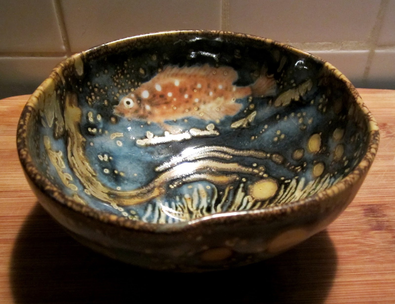J'admire leur travail à chaque fois que je vois leurs pièces, et cette année j'ai enfin acheté un bol. Je me suis toujours demandé comment ils réalisent les scènes de fond de mer sur leurs objets, et Catherine Salmon m'a expliqué qu'il s'agit de plusieurs couches d'émaux, dont certaines sont recouvertes de cire avant l'application des autres. La décoration doit demander énormément de patience, sans même parler des recherches d'émaux.