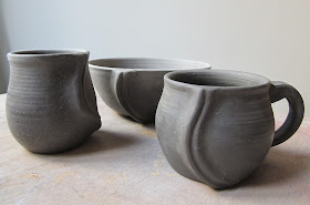 Je suis assez contente du résultat, même s'il est évident qu'il faut peaufiner l’exécution du design. Cette fois-ci, j'ai laissé les objets tournés sécher un peut trop longtemps avant d'appliquer les bandes de terre qui définissent la série. Si vous regardez de près le bol à l'arrière plan, vous verrez une petite fissure ; le bol partira donc dans le bac de terre à recycler (d'où il est venu.)