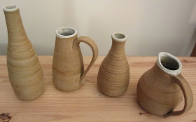 Il y a quelques semaines, j'ai tourné des bouteilles et des tasses (voir ce billet précédent.) J'ai souvent l'intention de mettre des photos d'avant et d'après la cuisson sur le blog, mais je ne le fais que rarement. Cette fois-ci, j'étais tellement contente des couleurs - résultat du mélange du grès de St. Amand et du grès roux chamotté - que j'ai pris des photos avant la cuisson....