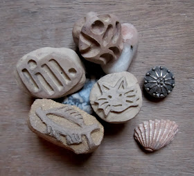 Suite à ma visite à l'atelier de la Salamandre, j'avais envié de créer des pièces tamponnées. Certaines pièces de Bertrand avaient des empreintes et/ou des marques qui les rendaient plus intéressantes. C'est une caractéristique que je note souvent sur les pièces cuites au four à bois. Mais pourquoi ne pas le faire sur mes pièces cuites au four électrique ?