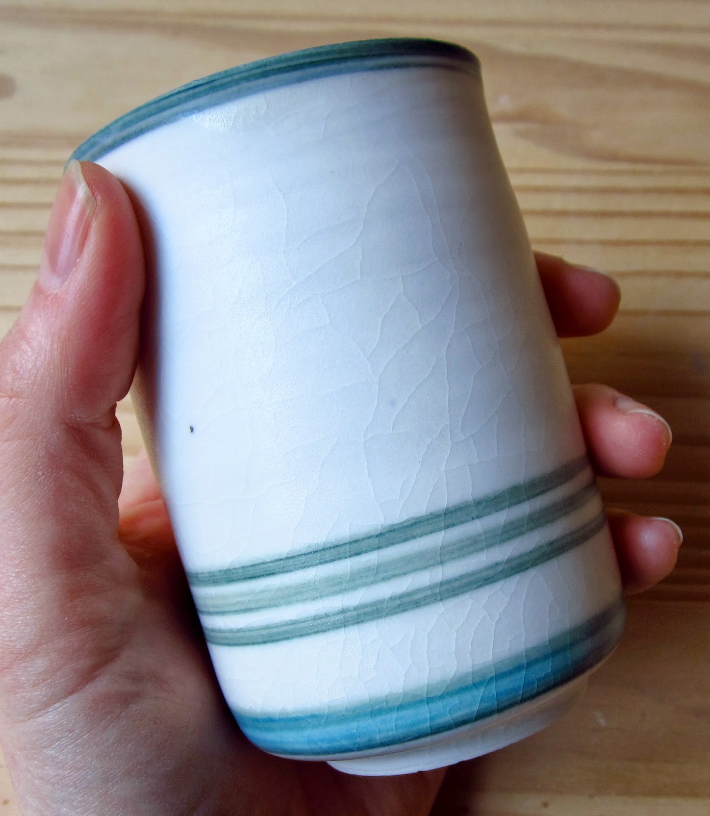 Au tournassage, j'ai remarqué que cette petite tasse avait un morceau de quelque chose dans la paroi. Lors de la cuisson, cette chose est partie, laissant un trou. A. va essayer de le remplir avec du verre, car à part ça la tasse me plait énormément. Les couleurs me rappellent des aquarelles.