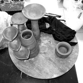 Peut-on continuer à faire de la poterie pendant qu'on s’apprête à vendre son appartement ? Sur l'étagère quelques objets attendent la cuisson, et il va bien falloir tourner un peu afin de remplir le four. J'étais tenté de tout mettre à la poubelle, mais en même temps j'avais très envie de faire cuire le château. (Oui, obsédée par la vente d'un appart, une potière commence à créer des châteaux. Je rêve également de structures de toutes sortes.) Aujourd'hui j'ai retrouvé les photos de sa création. Ce jour là, A. m'avait proposé de faire des formes architecturales, et j'ai commencé en tournant plein de petits bols: