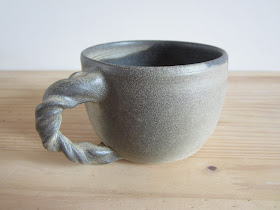 En ce qui concerne ces mugs, c'était autant un test de forme que d'émail. Je suis contente de la taille de ces mugs ainsi que des anses tordues. Cela dit, bien que la prise en main soit parfaite pour moi, pour A. l'anse est trop petite. Je pense que pour la prochaine série je vais faire des mugs dont l'anse n'est torsadée que sur le haut.