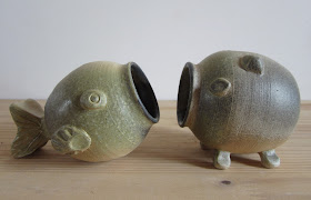 Le vert cristallisé de Solargil a donné de bons résultats sur les tirelires en grès blanc. Sur le poisson, j'ai également pulvérisé un peu de blanc par dessus le vert cristallisé.