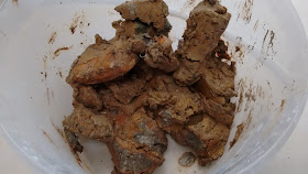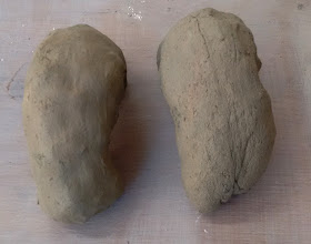 J'ai malaxé environs 800g de cette argile. Il a fallut enlever quelques cailloux et un peu de matière végétale, mais finalement l'argile était à peu près propre et d'une très bonne consistance.