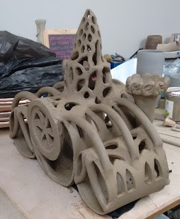 Au fait, j'ai commencé à imaginer la structure du châtophore en décembre quand je me suis arrêtée pour admirer les arc-boutants de l'église à Cherbourg (ci-dessous.) De plus, je venais de terminer la lecture de Les Piliers de la terre, un roman qui tourne autour de la construction d'une église gothique. Tout ça m'a donné envie d'intégrer certains éléments de cette architecture dans le prochain châtophore.