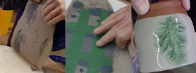 Et dimanche, je suis retournée à Ger afin de participer au JEMA de Terres d'Echange. Nous avons fait des tasses engobés. C.B. nous a initié au transfert des dessins faits sur une plaque de plâtre (voir visage ci-dessous) et à la technique "mocha tea" (voir tasse de droite ci-dessous.)
