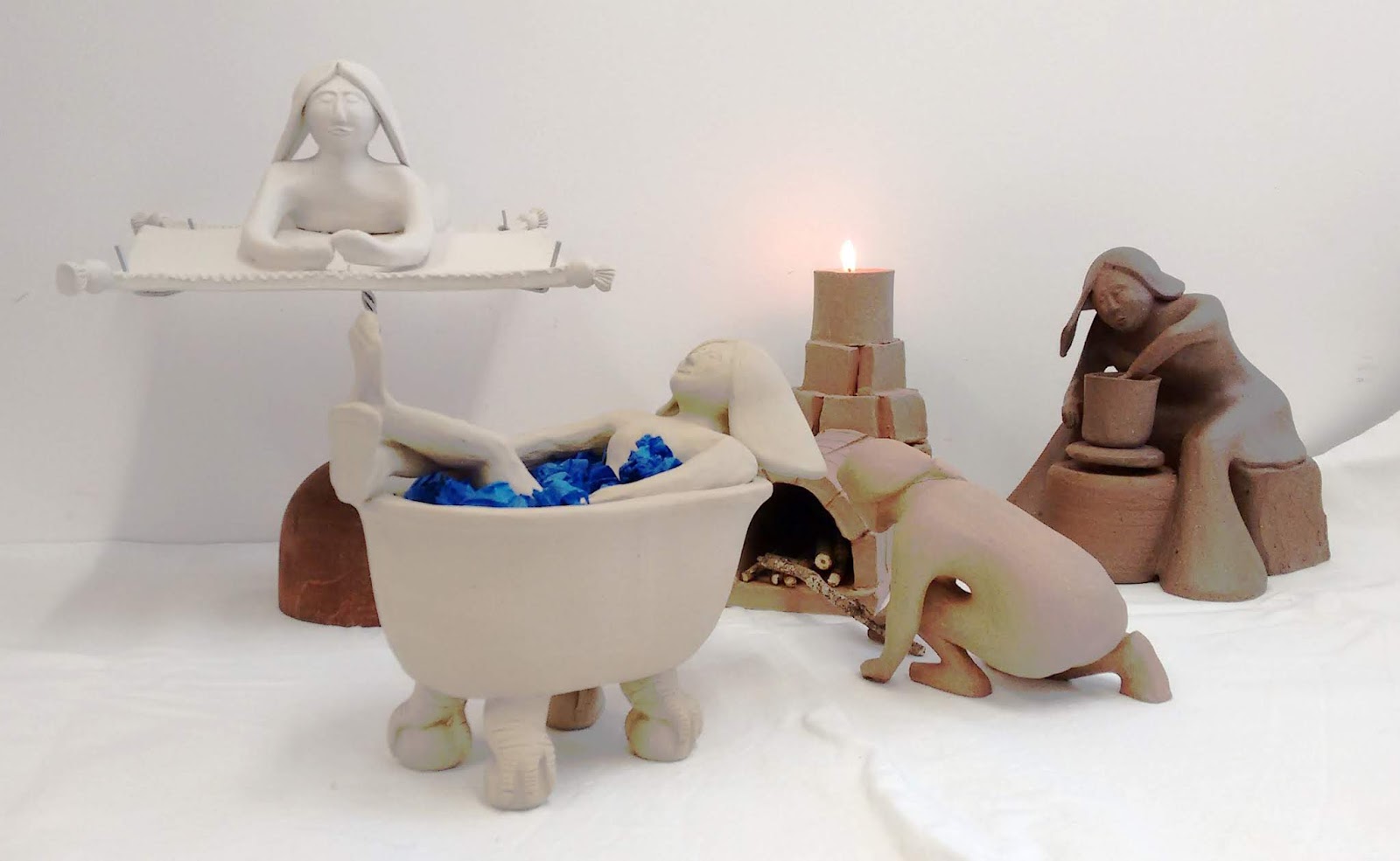 Le projet m'a motivé à faire un peu de modelage, avec une sculpture par élément représentant la potière dans tous ses états : au tour, au four, se débarrassant de l'odeur de la fumée, et sur son tapis volant. Bon, pour l'instant j'ai une Opel, mais on peut toujours rêver....