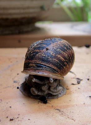Ce matin j'ai déplacé un de mes pôts dans mon "jardin" et j'ai découvert un escargot. Le même?