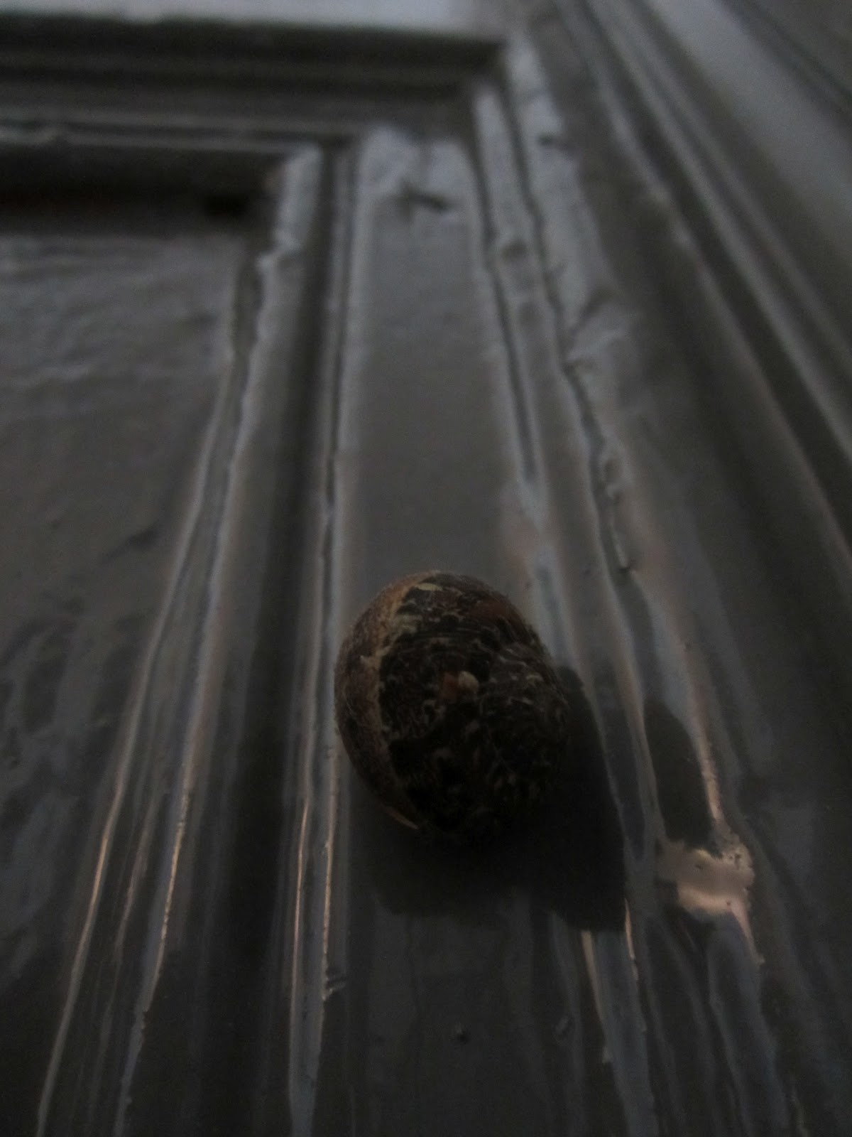 Hier il y avait un escargot sur la porte de l'appart, à peine visible dans le pénombre du couloir.