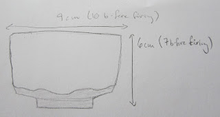 Ce matin je me suis lancé dans la fabrication des bols à thé. J'ai divisé la Shigaraki en 3. J'ai tourné deux bols comme dans le dessin (enfin, presque), et un troisième qui était plus épais. Avec le fil de fer, j'ai découpé des fines tranches de la parois de ce dernier. Ensuite, je l'ai fait tourner pour adoucir les angles.