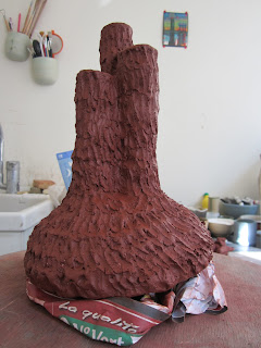 En ce moment j'ai beaucoup de terre recyclée à utiliser. Elle est plus ou moins de la bonne consistance, car il m'arrive de la laisser sécher trop longtemps. Avant de tourner cette terre, il faut la malaxer dans l'espoir d'avoir une consistance homogène et d'éliminer les bulles d'air. Une partie de l'air part lors du malaxage et lors du centrage, mais souvent je rencontre encore des bulles en montant la paroi. Avec un peu de chance, j'entends une mini-explosion : la bulle éclate ! Mais parfois je ne découvre les bulles qu'après la cuisson, en voyant la paroi déformée.